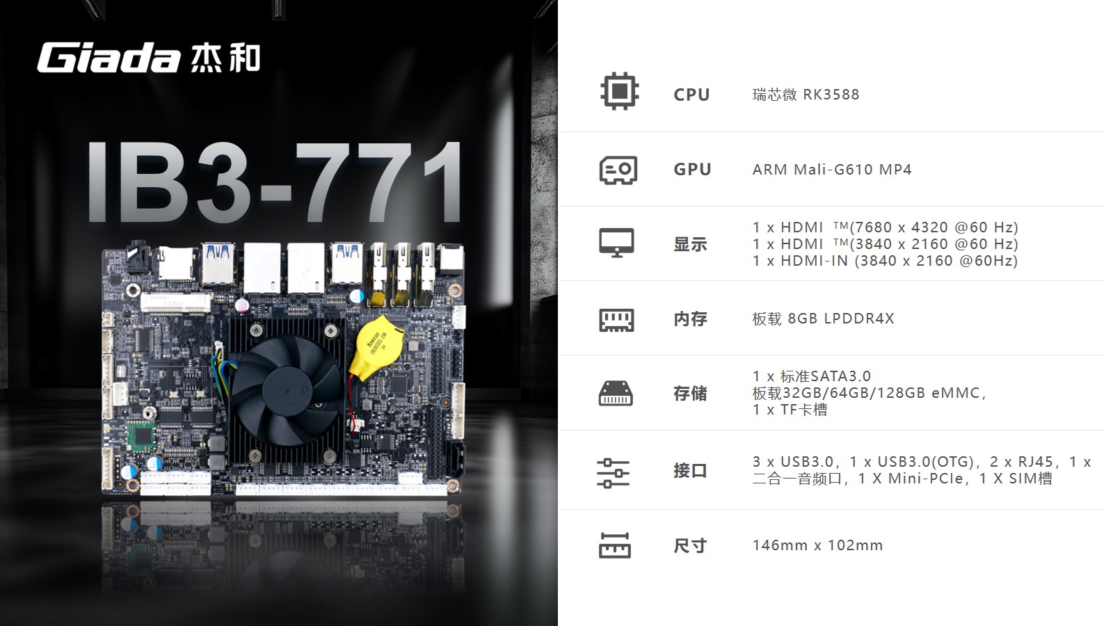 J9平台-J9(中国)工业级ARM主板IB3-771采用瑞芯微RK3588处理器,内置G610 MP4 GPU,拥有6 TOPS算力的NPU,支持8K视频硬件解码编码及多摄像头输入,支持eDP/DP/ HDMI2.1/MIPI 多种显示接口。