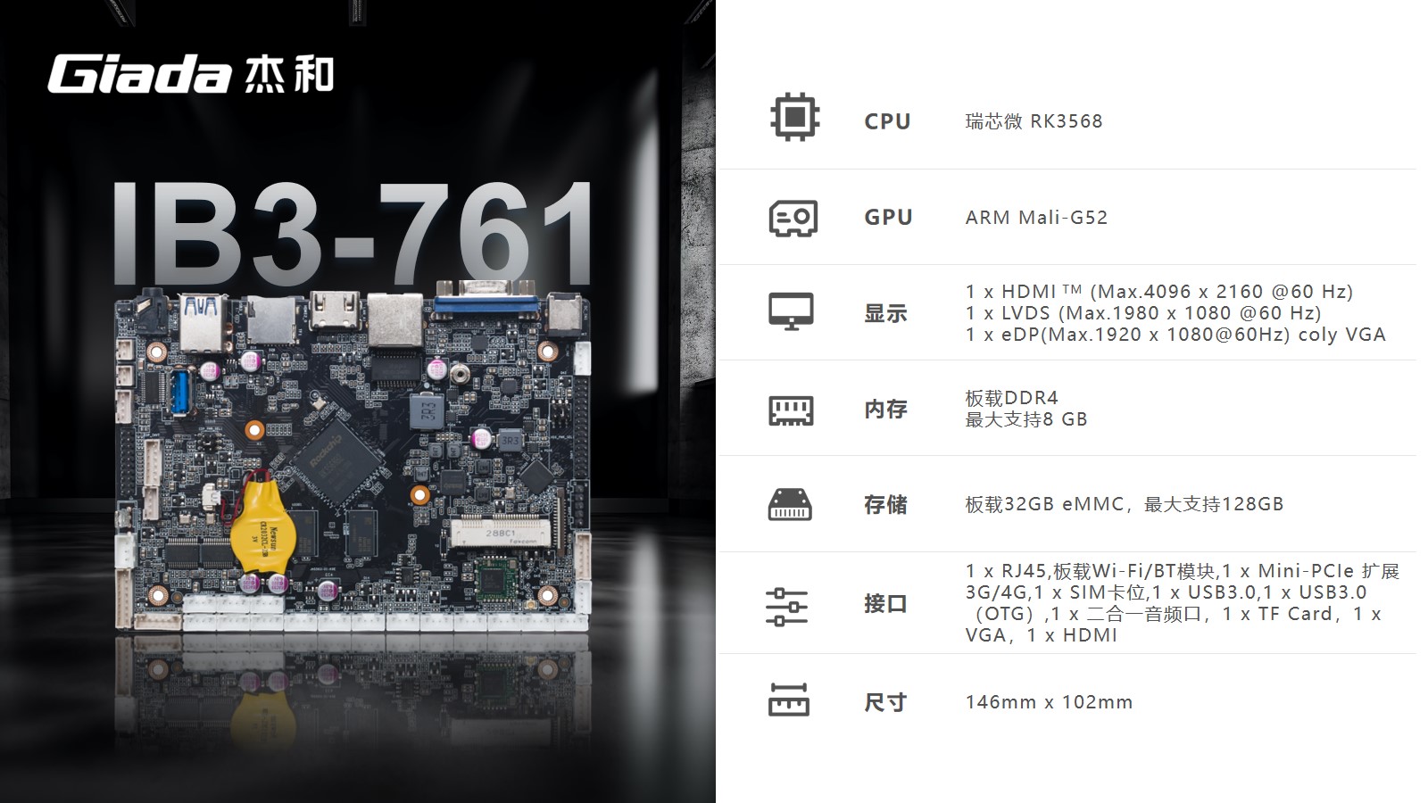 J9平台-J9(中国)工业级ARM主板IB3-761基于瑞芯微RK3568四核64位处理器开发。内置1TOPS算力的NPU,满足轻量级端侧AI计算应用。