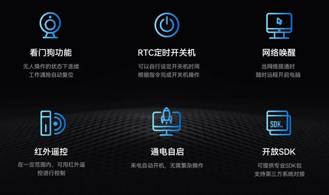 通过定时开关机、看门狗计时器、RTC宕机自检、红外遥控和局域网唤醒等功能,实现设备绿色运行。
