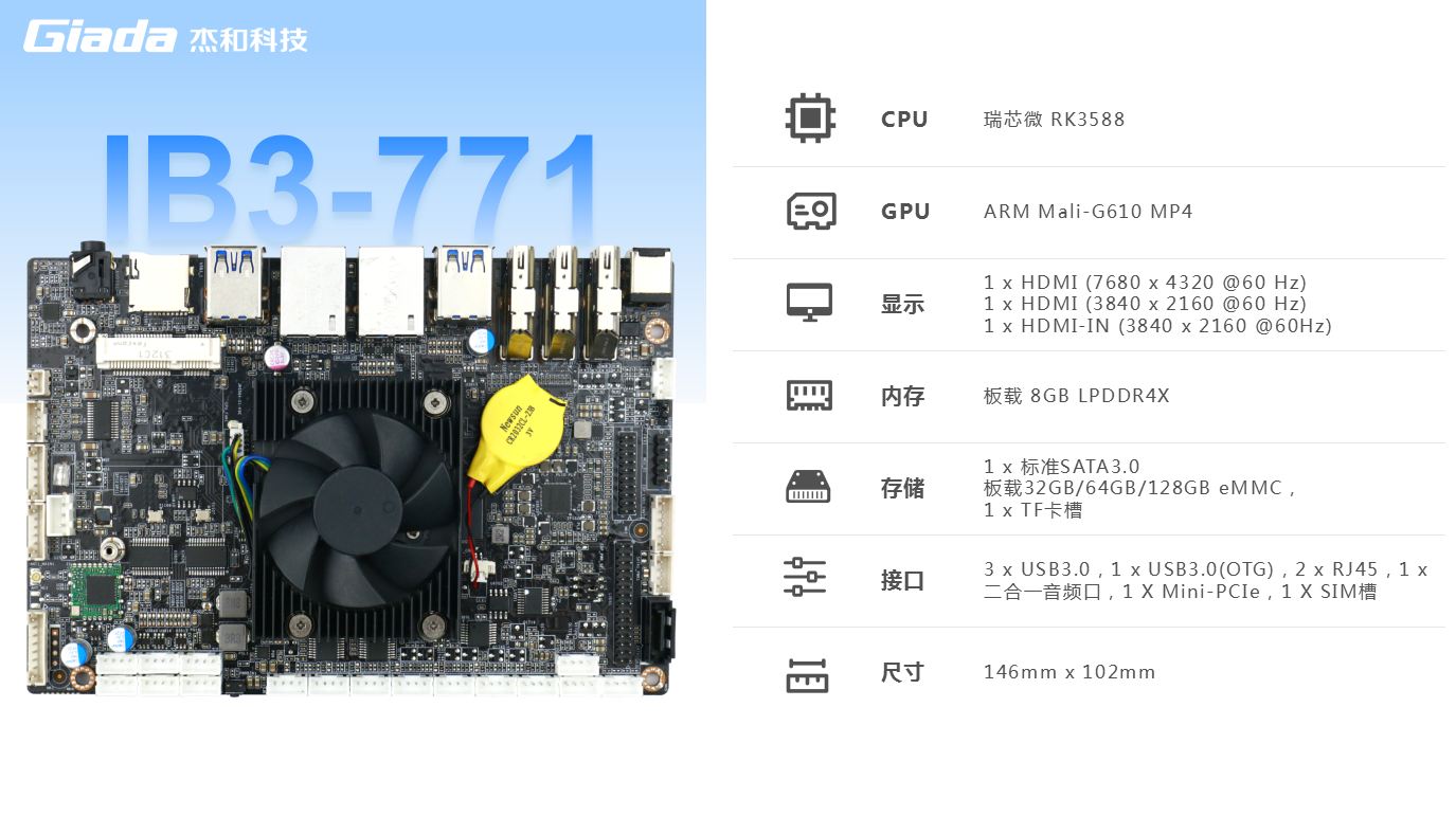 J9平台-J9(中国)科技IB3-771支持瑞芯微旗舰级RK3568(4*A76+4*A55@2.4GHz)八核64位处理器,集成ARMMali-G610 MP4 GPU,高算力、低功耗、具备强大的视觉处理能力;性能强悍的RK3588内置AI加速NPU,提供6TOPs算力,支持 INT4/INT8/INT16/FP16 混合运算,其强大的兼容性,可以轻松转换基于TensorFlow / MXNet/PyTorch/Caffe 等一系列框架的网络模型,为各类AIoT应用场景提供优秀的性能表现;板载8GB LPDDR4X内存,支持1x标准SATA3.0接口,可扩展SSD/HDD硬盘,板载32GB/64GB/128GB eMMC,支持1 x TF卡槽,多种形式轻松增加存储容量。