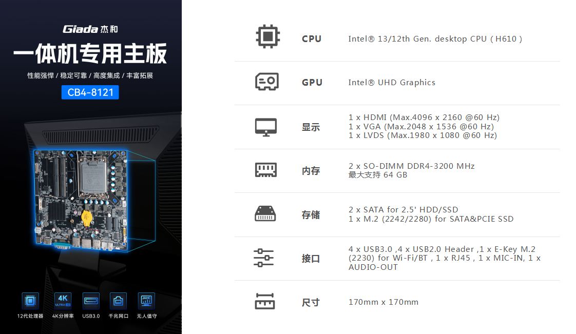 一体机在使用体验方面也有独特的优势:比笔记本屏幕大,比台式机更简洁,也解决了一直为人诟病的台式机线缆多而杂的问题,另外,随着计算机硬件和制造工艺的不断发展,一体机的性能也在不断提高,因此,越来越多的教育办公、日常娱乐和学习的用户选择使用一体机。GiadaJ9平台-J9(中国)科技根据市场与客户需求,推出这款高性能的一体机专研主板CB4-8121,带来全新震撼体验。